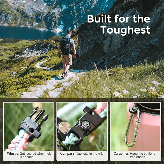 - The Go-easy Water Bottle: Benefit from the cool features of this bottle with a built-in ergonomic handle and the straw lid ensures you chug at ease anytime, while chug lid allows you to refresh in huge gulps when a quick boost is called for. Plus, survival paracord integrating a whistle and compass for extra portability and practicality