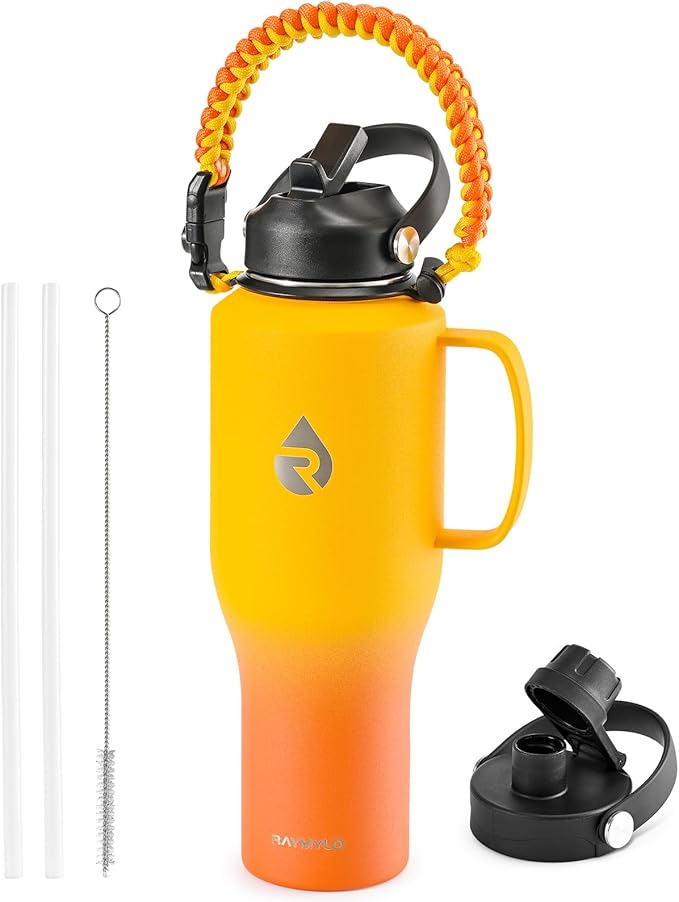 - 100% Satisfaction Support: We offer continuous after-sales service, making sure this bottle sticks around in its top game for years. Package contains 1 x RAYMYLO Car Water Bottle with Handle, 1 x Straw Lid with 2 x Straws & 1 x Straw Brush, 1 x Spout Lid, 1 x Paracord Handle