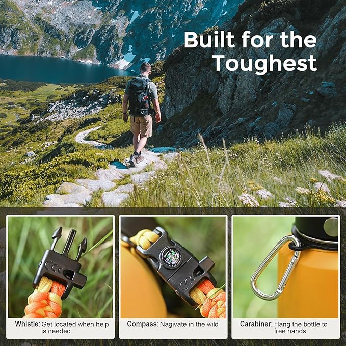 - The Go-easy Water Bottle: Benefit from the cool features of this bottle with a built-in ergonomic handle and the straw lid ensures you chug at ease anytime, while chug lid allows you to refresh in huge gulps when a quick boost is called for. Plus, survival paracord integrating a whistle and compass for extra portability and practicality