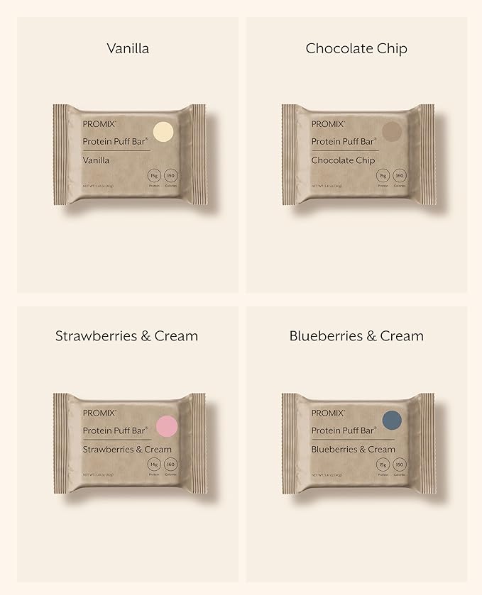 - A High-Protein Treat: ProMix Protein Puff Bars combine our Whey Protein Puffs and marshmallow for a tasty, rice Krispy-like snack with 15g of protein and just 5g of sugar — 40% less than the leading protein bar. Vanilla, Chocolate, Strawberry, and Blueberry flavor. 12 bars per box.