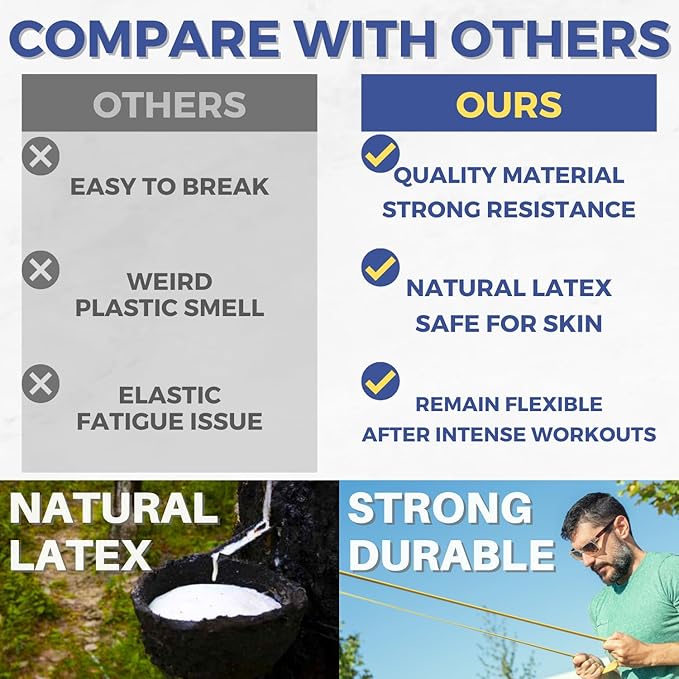 - 【NATURAL, NON-TOXIC AND DURABLE】:Our resistance bands are made of natural latex, they are non-toxic and non-irritating to skin, safe for all level users, due to quality raw material, they are very durable amd flexible that can withstand extreme force, give you a big hand when doing intense workouts, our resistance band can last for years, help you save money from buying others poor band.