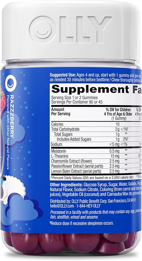 - DELIGHTFULLY TASTY: OLLY Sleep gummies come in Razzzberry flavor with other natural flavors, no synthetic colors or flavors and are gluten free. These sleep support* supplements are a delightful blend of drug-free ingredients. 50 gummies per bottle.