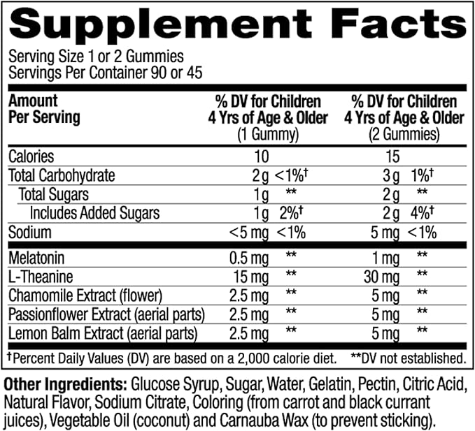 - HOW TO TAKE: Ages 4 and up, start with 1 gummy and give up to 2 gummies as needed 30 minutes before bedtime. Chew thoroughly before swallowing.