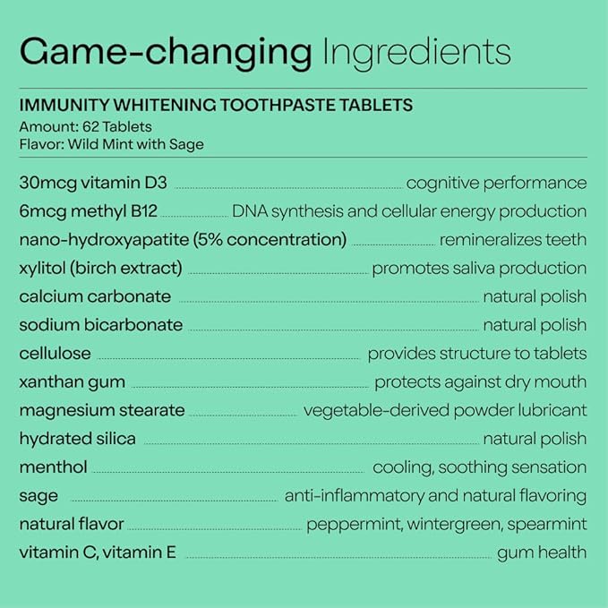 Duo Immunity Toothpaste Tablets | Vitamin D3 + B12 w/Nano-Hydroxyapatite (nHa) - Whitening, Remineralize & Reduce Sensitivity | Sustainable & Plastic Free | Wild Mint w/Sage, 1 Bottle/ 62 Tablets