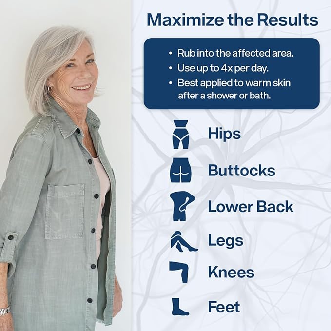 - Fast Absorbing: Packed with powerful and nourishing compounds, SciatiFlex is the perfect sciatic nerve cream you can massage on your back, hips, legs, joints, and sore muscles. Just rub a pea-sized cream into the skin 2-4x a day as needed.