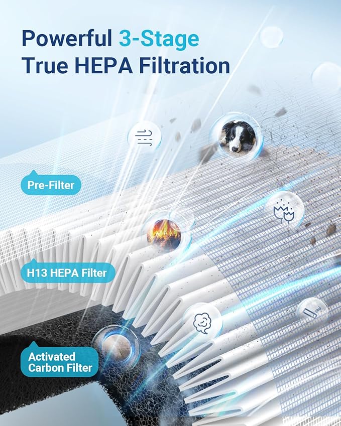- High Efficiency Filtration:With 360-degree inlets and 3-Stage Filter, Mooka M03 air purifier can effectively filter larger particles, up to 1500ft² coverage, and quickly refresh a room of 400 ft² in just 15 minutes. Faster Air Purifiers for Bedroom, living room, kitchen, office, baby room, basement, hotel, etc. Perfect for pet owners, babies, children, the elderly, or anyone who wants to improve air quality.