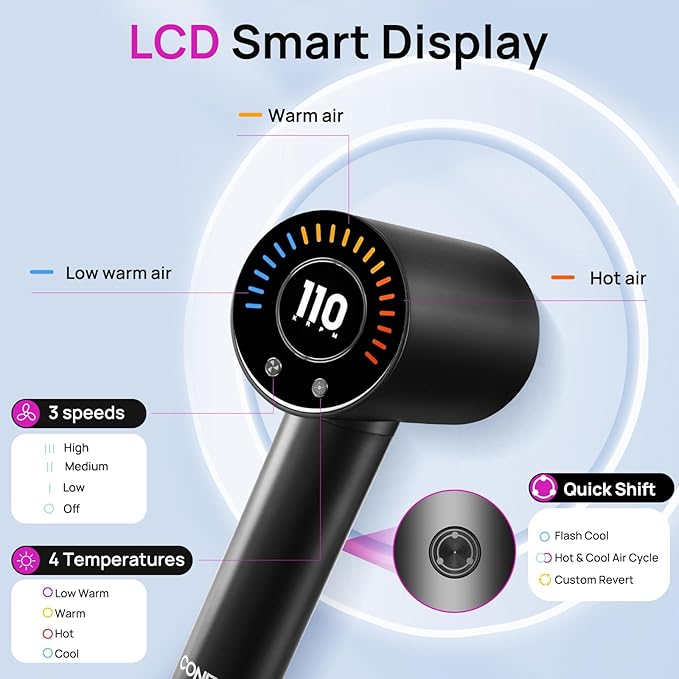 - Customizable Intelligent Temperature and LCD: Hair dryer customize 4 heat settings (low warm, warm, hot, cool) and 3 speeds (75K, 95K, 110K RPM) easily, giving you a customizable dry experience. Quick Shift button can instantly switch to cool air, hot/cool air cycle, or reverts to your custom Settings. It accurately meets the needs of different hair types and combines professional efficiency with safe and gentle, meeting the diverse needs of pet care and sensitive scalp protection for children/seniors