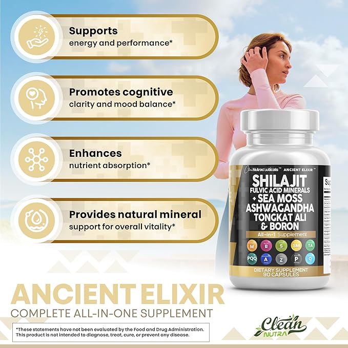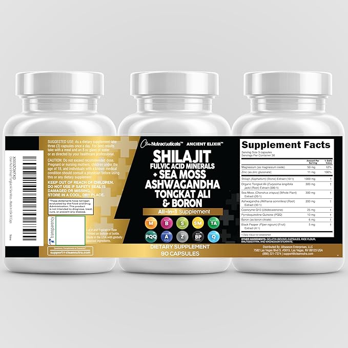 Clean Nutraceuticals Shilajit Supplement for Men with Sea Moss, Tongkat Ali, Ashwagandha, Boron, Zinc, CoQ10, PQQ - Fulvic Acid Capsules - Energy Support - 90 Count - Resin, Gummy & Powder Alternative
