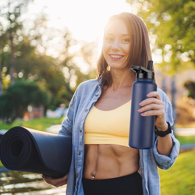 DOMICARE 40 oz Insulated Water Bottle, Vacuum Insulated Stainless Steel Sports Water Bottle with Straw Lid & Spout Lid, Leakproof, Reusable - Travel, Camping, Bike, Navy Blue