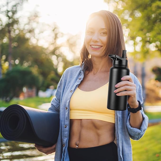 DOMICARE 32 oz Insulated Water Bottle, Vacuum Insulated Stainless Steel Sports Water Bottle with Straw Lid & Spout Lid, Leakproof, Reusable - Travel, Camping, Bike, Black
