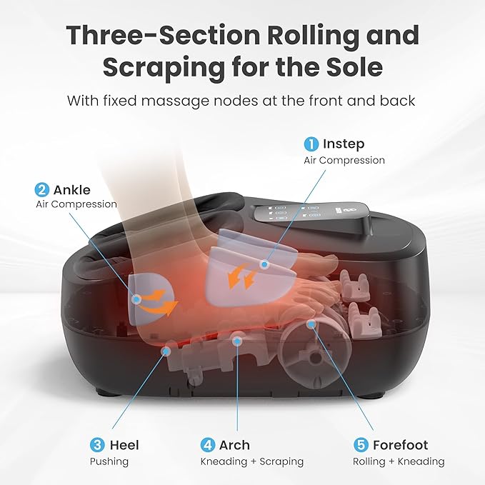 - Deep Kneading & Rolling Massage: Experience comprehensive foot relaxation with three-section rolling and scraping for the sole.Fixed massage nodes ensure thorough coverage and target key pressure points for ultimate relaxation.Three intensity levels allow you to tailor the massage to your needs, just like a shiatsu foot massager.