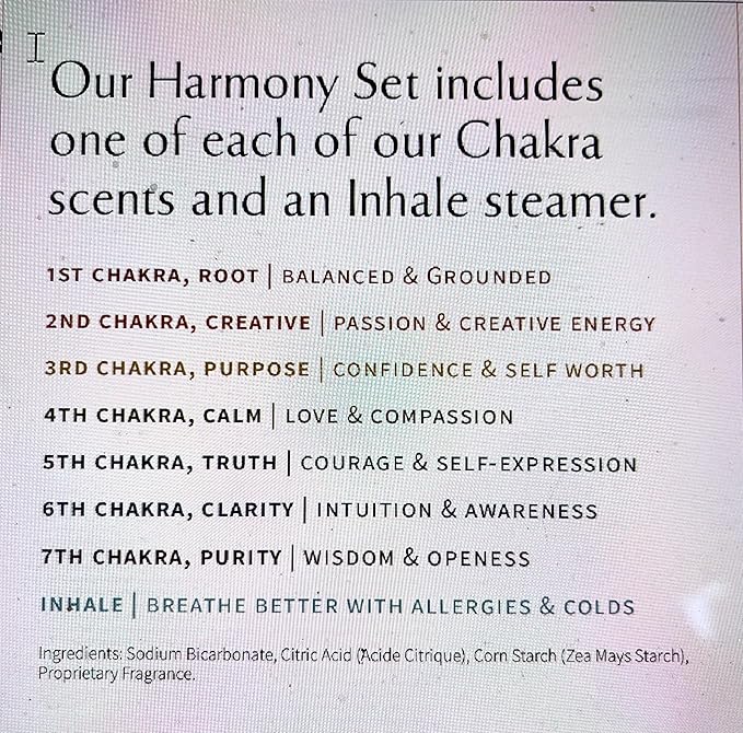 - "HARMONY" VARIETY SET (12 SHOWER STEAMER :(One of the each): 1st Chakra “Root” (Blackberry, Amber, Bergamot, Sweet Viola, White Cypress): 2nd Chakra “Creativity”( Bergamot, Sicilian Lemon, Tangerine, Lime): 3rd Chakra “Purpose”(Blueberry, Bergamot, English Thyme, Rosemary, Sicilian Lemon): 4th Chakra “Calm”(Peach, Bergamot, Gardenia, Rose): 5th Chakra “Truth”(Peach, Cedarwood, Bergamot, Neroli): 6th Chakra “Clarity”(Lychee, Yuzu Fruit, Geranium, Lily): 7th Chakra “Purity”(Lemon Verbena, Coconut)