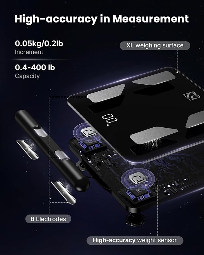- [High Precision Measurements for Full Body] The body composition scale utilizes an 8-electrode technique for segmental BIA, comprehensively measuring five segments of your body (four limbs and torso) using double frequency. Equipped with eight high-precision sensors, this scale for body weight accurately tracks weight with a 0.2 lb accuracy and supports weights up to 400 lbs. For accurate results, please read the instructions carefully before use. Maintain the correct posture during the measurement process (FSA / HSA eligible)