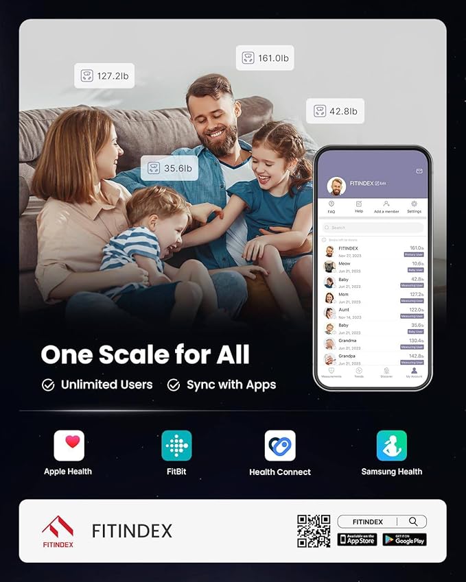 - [Unlimited Users] The FITINDEX app allows you to create more than 30 user profiles, managing each user's data individually. It enables data sharing with Apple Health and Samsung Health, and is compatible with Apple Watch. The scale with bmi, body fat, muscle mass help you conveniently monitor your physical condition