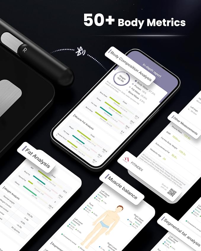 - [Track Progress Easily] The smart scale with FITINDEX app generates a comprehensive body composition analyzer report, accurately detailing index data for each part of your body. With this information, you can tailor exercises and diet plans to improve arm strength, abdominal muscles, thighs, and overall physical health. The app provides detailed charts and trends for 50 body composition metrics over weeks, months, or years, helping you track health and fitness goals with precision and convenience