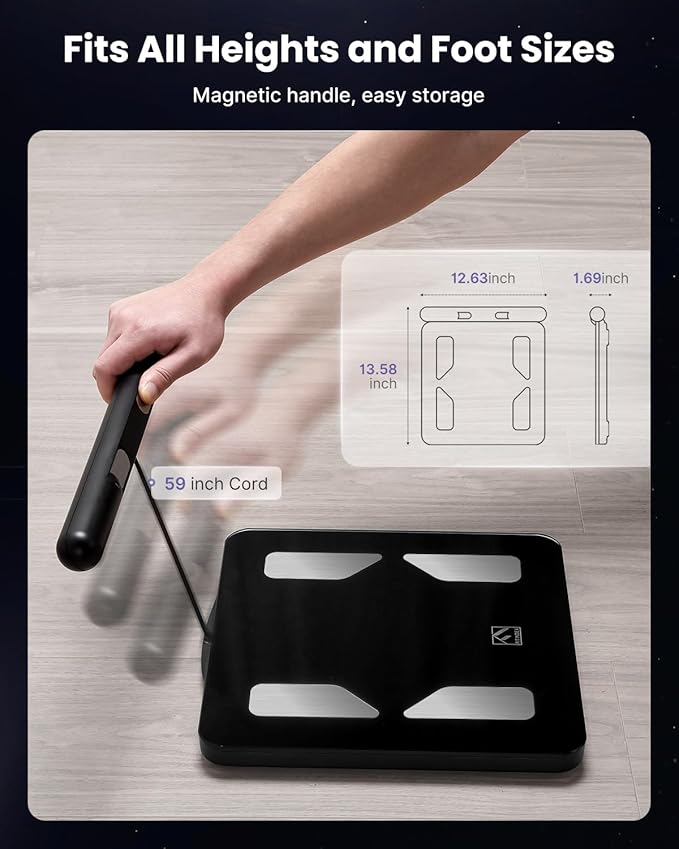 - [Convenient & Durable] The all-in-one display shows seven basic indicators at a glance. Featuring a minimalist design with a retractable handle for easy storage, it includes a 59-inch long line suitable for users of all heights. The scale's black 6mm tempered glass and ABS black bottom shell ensure durability and stability. The body fat scale is the perfect combination of convenience and durability (Tips: Gravity startup 11-15 lb)