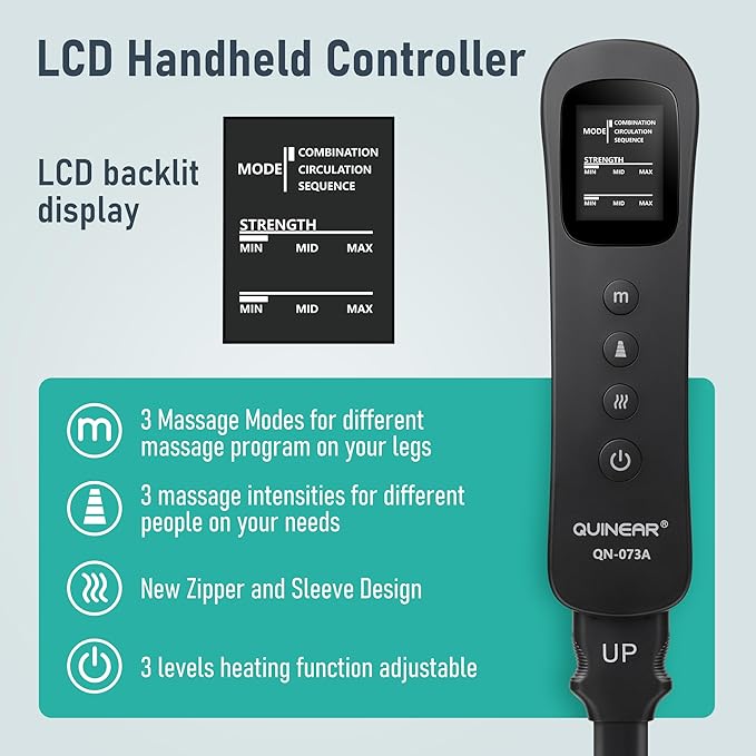 - PRO GRADE LEG HEATING MASSAGE - QUINEAR Leg Compression Massager is a powerful must-have leg recovery system. Heat opens blood vessels, which can assist the healing process and alleviate some of your pain. 3 levels of HEATING function to provide suitable warmth for your legs through all year, pretty effective to warm up cold foot & leg,reduce leg tiredness and promote circulation flow.