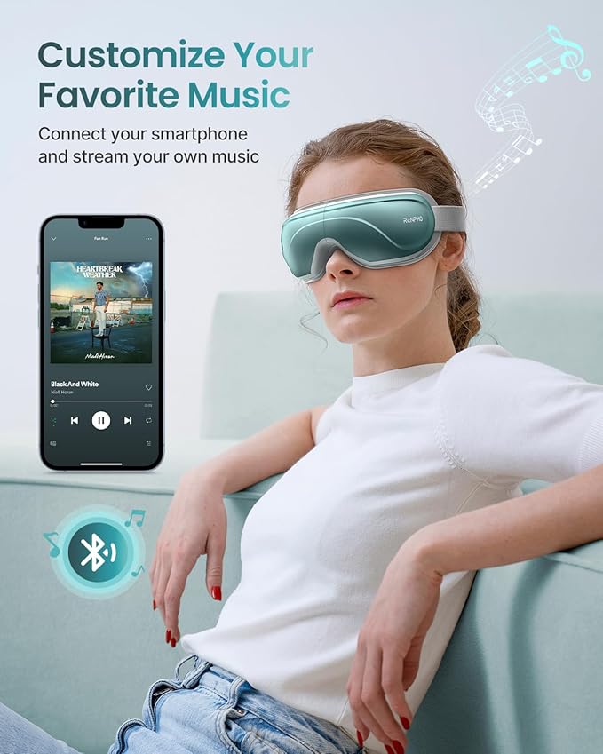 - Personalized Massage: Adjust the pressure, heat, and vibration settings to create a massage session tailored to your preferences. With 2 pressure levels and 2 heat options, the heated eye massager enables you to select the intensity and warmth for targeted relief. Three auto-off timers allow you to choose the desired massage duration that fits seamlessly into your daily routine. Connect your smartphone via Bluetooth to play your favorite playlist directly through the temple massager for an immersive experience.
