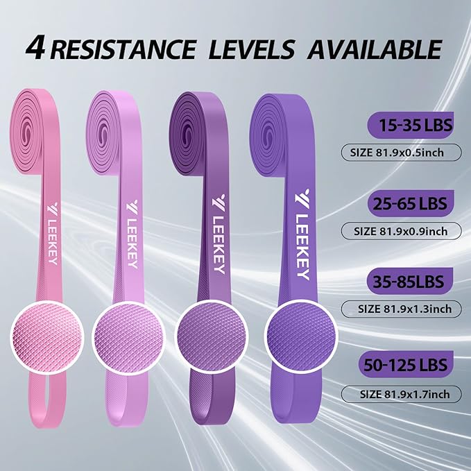 - 4 Resistance Bands Levels: Pull up assist bands come in 4 resistance levels, and each color is different resistance and width for different purposes. 1- (15 - 35 lbs) ; 2- (25 - 65 lbs); 3- (35 - 85 lbs);4- (50-125lbs)