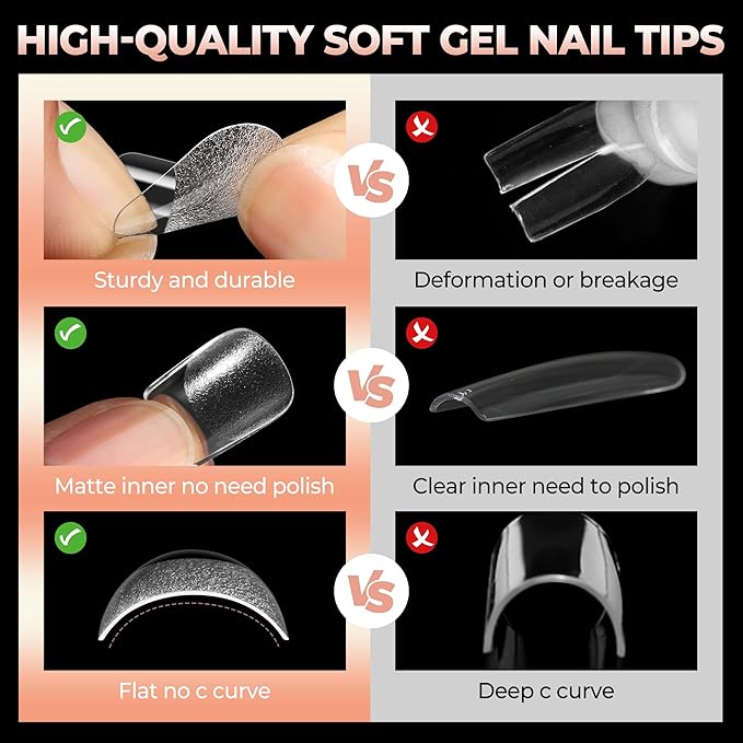 - ๐ ใULTRA FIT SEAMLESSใThe extra short square gel nails feature โ thick front edge, thin back edgeโ. The thin back features flat no c curve allows for the full cover nail tips better fit your nails without bubbles. The clear almond nail tips makes glossy color for easy to apply. The thicken tips makes not easy to break, has a long lifespan. Just like your real nails!