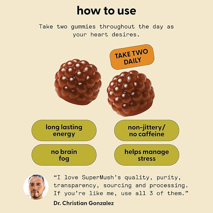 - SUPERIOR ENERGY SUPPORT - Unlike many supplements that use mycelium grown on grain, our gummies contain pure fruiting body extracts with verified active compounds. The Cordyceps and Lions Mane extracts come from whole mushrooms, cultivated for maximum potency. Our mushroom gummies are elevated with Peruvian Maca root and pure L-Theanine. Maca, a superfood herb, improves mood, energy, and stamina. L theanine, found in green tea, promotes an alert yet relaxed state of mind.