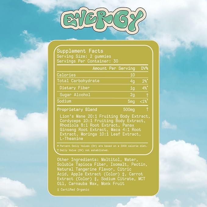 - ENHANCED ENERGY FORMULA - Featuring a unique and potent blend of Cordyceps, Lion's Mane mushroom extract, Rhodiola, Panax Ginseng, Maca, Moringa, and L-Theanine, these gummies support focus and energy naturally. Lion's Mane aids mental performance and memory, while Cordyceps helps fight fatigue and increase oxygen flow to the muscles. With the relaxing amino acid L-Theanine, these tangy tangerine gummies provide calm, centered energy, making them a top choice for focus and stamina.