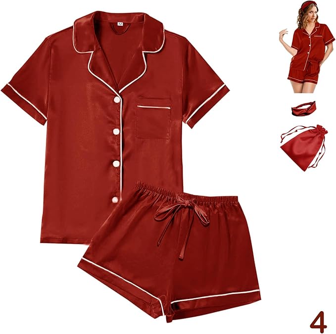- Product Features:Two Piece Pajama Set featuring classic sleepwear style.Short sleeve sleepwear top and pajama shorts set. Premium ultra soft silk satin material in very high quality and this sleep set with superior stitching and perfectly-lined hems. Breathable and Comfy sleepwear set. Wash Care: Hand wash separately in cold water is recommended.