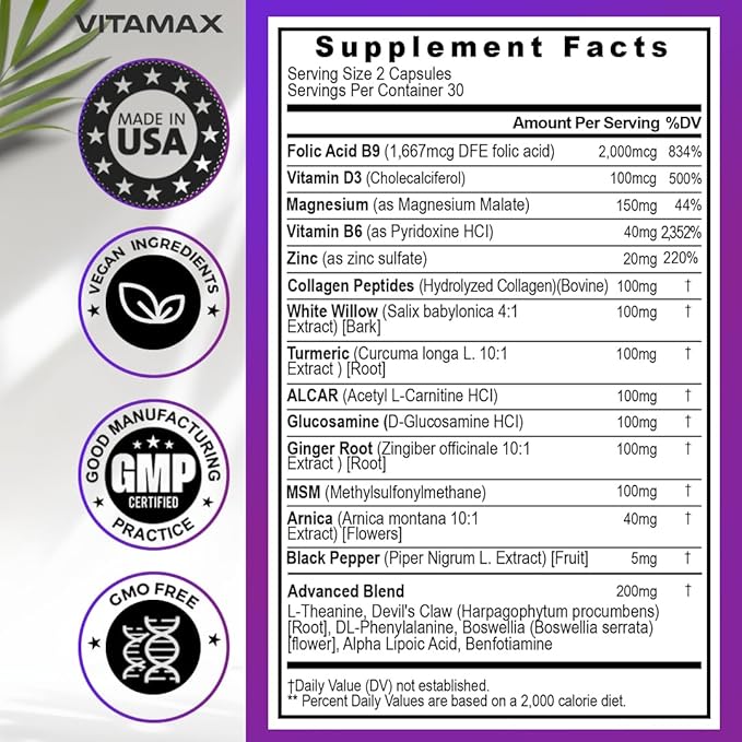 - Packed Relief Driven Vitamins and Minerals : Every serving of Nerve-Plus is a rich source of 20 vital nutrients, including Alpha Lipoic Acid, MSM, Magnesium, Arnica, Turmeric, Vitamin B6, Vitamin B9, and Glucosamine all in one supplement capsules. We prioritize natural ingredients, carefully sourced from sustainable and environmentally conscious farms, guaranteeing that only the finest, market-leading ingredients make it into our product.