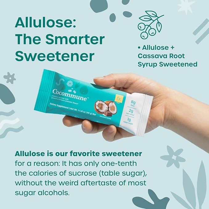 - 1g Sugar, 2g Net Carbs - Many high fiber snacks or coconut bars contain sugars, artificial sweeteners or sugar alcohols that can irritate the GI tract. Cocommune contains 0g total sugar and is sweetened primarily with allulose for minimal glycemic impact.