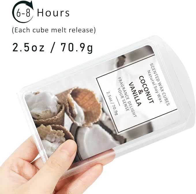 - Wax Melts Wax Cubes Package: The wax cube gift set includes 8 scents, each scent has 8 cubes, 70.9 g (2.5 oz) each cubes.