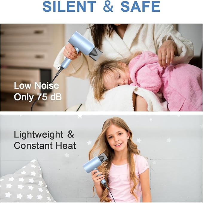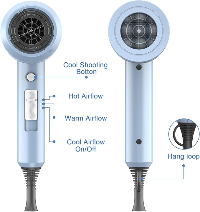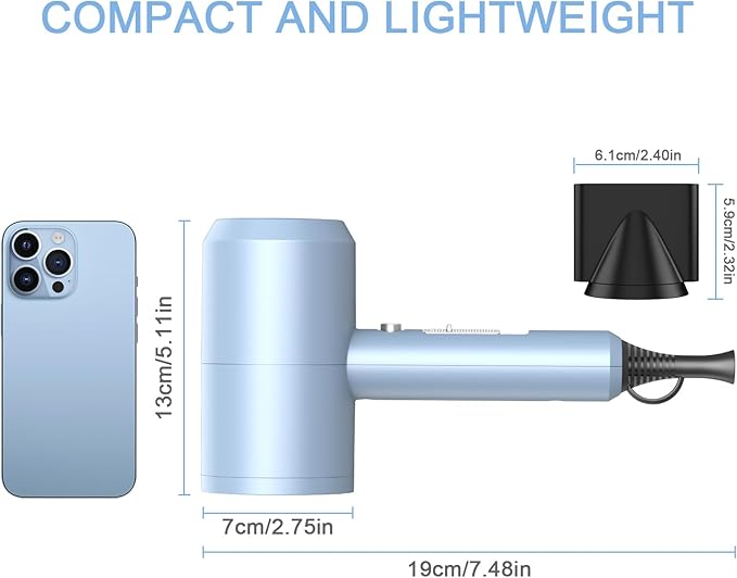 - Powerful Motor for Faster Drying: The professional hair dryer delivers strong wind for fast drying even thick wavy hair in less time, because of the high airflow motor, up to 21,000 rpm. Compact design will be more lightweight & portable.
