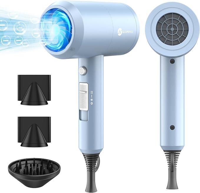 Slopehill Professional Ionic Hair Dryer, Powerful 1800W Fast Drying Low Noise Blow Dryer with 2 Concentrator Nozzle 1 Diffuser Attachments for Home Salon Travel (Matte Blue)