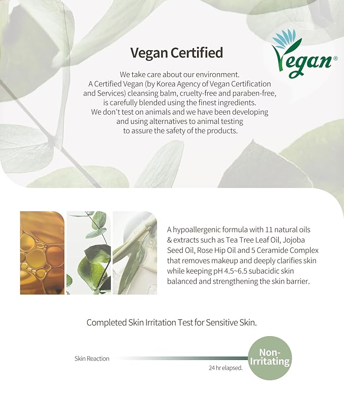 - [Vegan Certified / Hypoallergenic with Natural Ingredients] Absolutely Vegan Certified by Korea Agency of Vegan Certification and Services. A hypoallergenic formula with 11 natural oils & extracts such as Tea Tree Leaf Oil, Jojoba Seed Oil, Rose Hip Oil and 5 Ceramide Complex that removes makeup and deeply clarifies skin while keeping pH 4.5~6.5 subacidic skin balanced and strengthening the skin barrier.