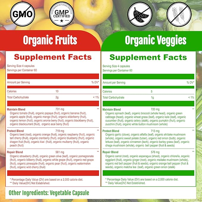 - 480 Super Fruits and Vegetable Capsules: Our product includes 240 organic fruits vegan capsules and 240 organic vegetable vegan capsules - a total of 480 red and green superfood capsules for 2 month supply. It is the most value added fruit vegetable supplement