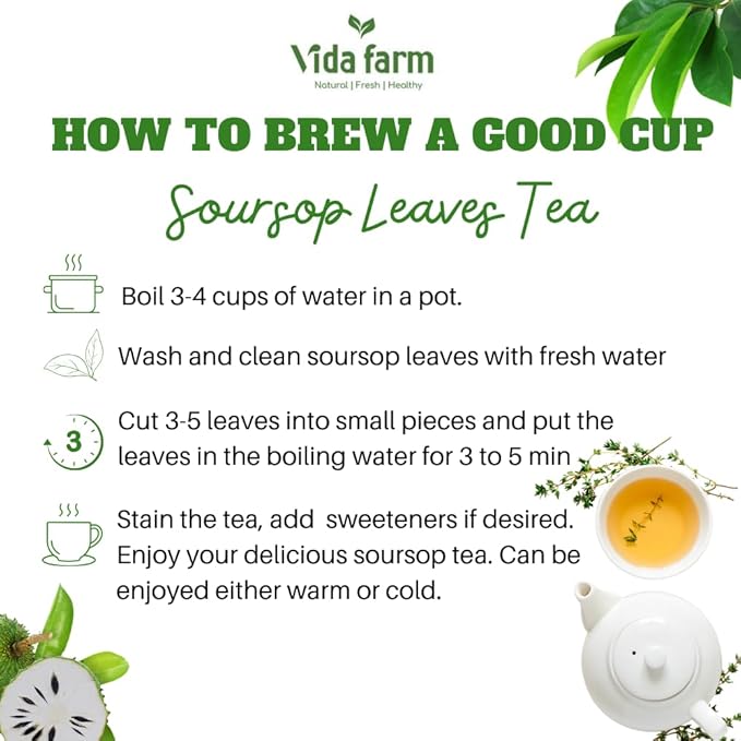 - 100% HIGH QUALITY NATURAL NON-GMO SOURSOP LEAVES TEA: Our soursop leaves come from the large farm which meets the highest standard in cultivating. The best graviola soursop leaves are hand-picked by local farmers at the optimal time, ensure to select premium leaves to make great soursop guanabana tea