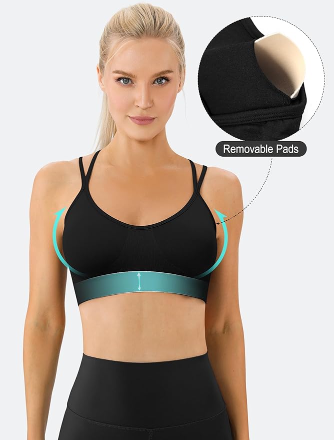 - Removable Padding & Wireless:Customize your look with insertable/removable cups and wash them separately. The wireless design of our strappy back sports bra eliminates rib cage pressure for all-day comfort.
