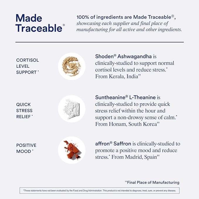 - MADE TRACEABLE: with Ashwagandha from Kerala, India, L-Theanine from Honam, South Korea, and Saffron from Madrid, Spain.*