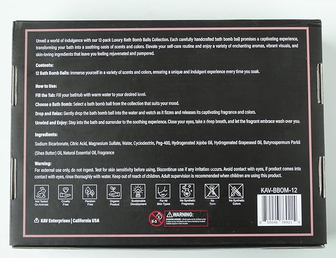 - BEAUTIFUL GEODE DESIGN — Includes 12 bath bombs crafted to create an Instagram-worthy soak. Unique geode embedded molds dissolve into rich color and fizz, offering a luxurious, relaxing experience. These KAV bathboms are sure to create an awesome experience.