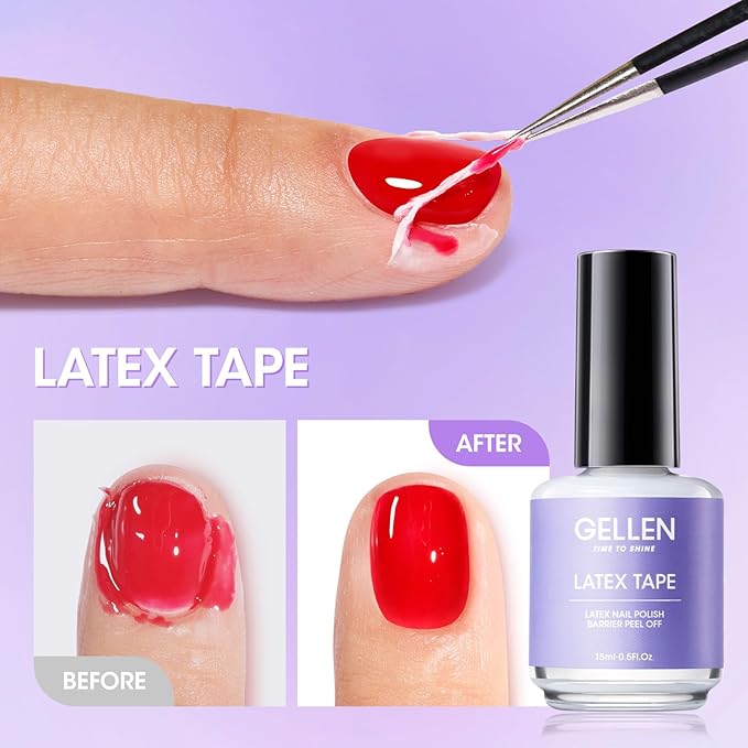 - 【How to Use Gellen Nail Latex Tape?】: This latex nail polish barrier peel off is super easy for use. 1. When you are using the gel nail polish remover, we suggest you apply this latex tape for avoiding a direct touch of your skin & the polish remover, reaching a protective result. 2. You can also apply this liquid latex for nails to areas where you want free of polish. 3. Dry for 1-2 minutes until it turns clear. 4. Rub the edge of latex tape with your finger or tweezers and peel it off.