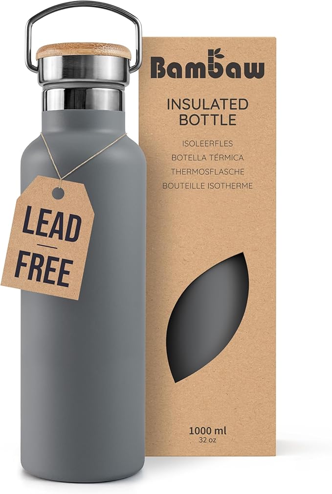 Bambaw 32 oz Water Bottle, Gray Double Wall Insulated Water Bottle, Stainless Steel Water Bottle, Thermo Water Bottle, Women and Mens Water Bottle, 1 Liter Water Bottle – Stormy Gray
