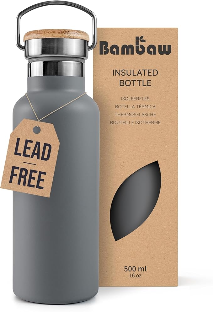 Bambaw 16 oz Water Bottle, Gray Insulated Water Bottle, Metal Water Bottle That Fits in Cup Holder, Hiking Water Bottle, Stainless Steel Water Bottle, Refillable Water Bottle – Stormy Gray