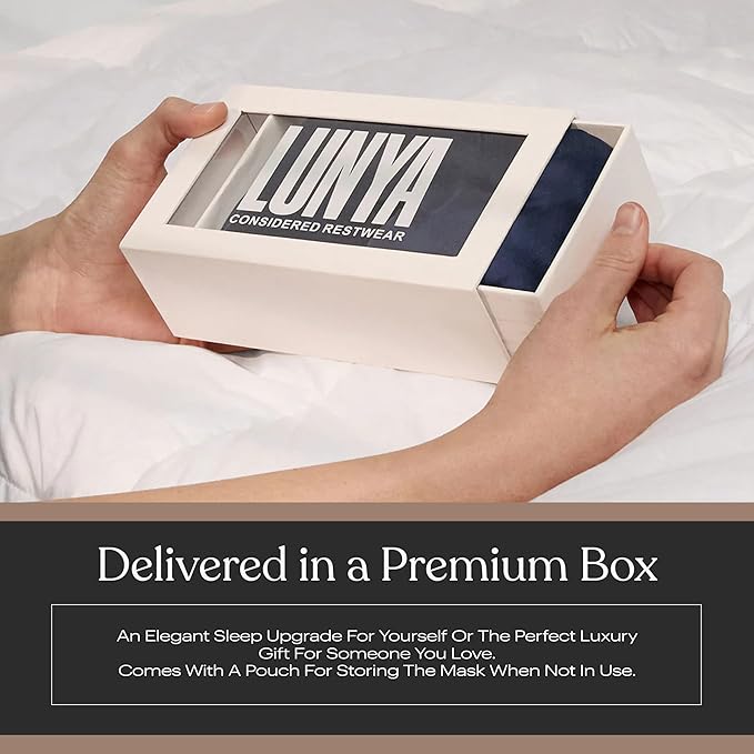 Lunya Sleep Mask with Box - Washable Silk Sleeping Mask and Headband for Beauty Routines - Thermoregulating Comfort for Restful Nights - Silk Eye Mask for Women - Small - Deep Blue