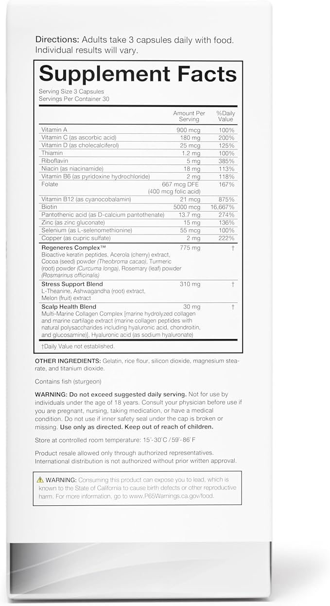 - KEY INGREDIENTS: Regeneres Complex- With a patented, bioavailable form of hydrolyzed keratin and melanin plus vitamins and minerals, this powerful blend regrows thicker, stronger hair, improves hair brightness and luster, and reduces greying.* Stress Support Blend- Specialized melon extract and L-theanine with ashwagandha help reduce stress and stress-related free radical damage to support healthier hair and hair growth.* Scalp Health Blend- Collagen peptides, hyaluronic acid, and proteoglycans nourish the skin to support scalp health.*