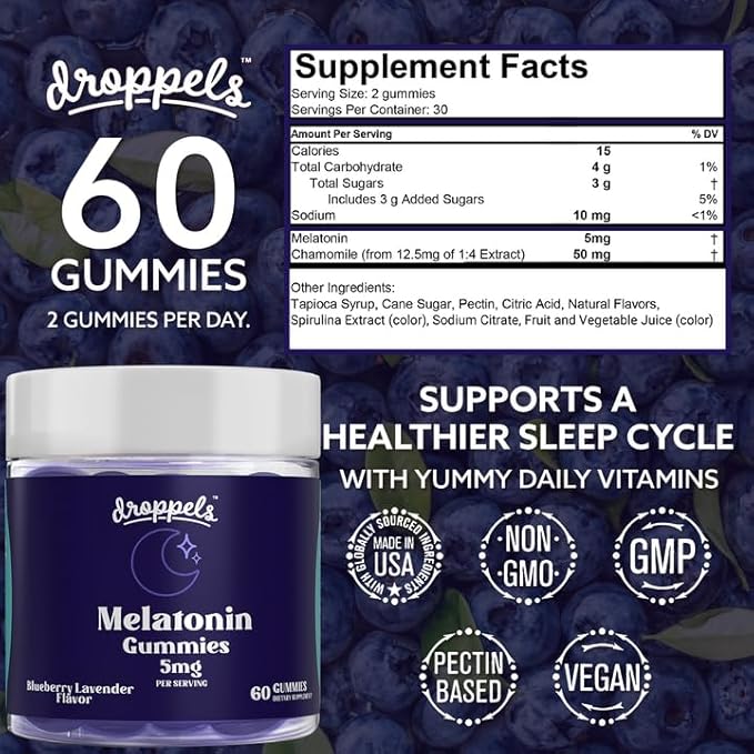 - A SWEET TREAT TO A GOOD SLEEP — Droppels Melatonin Gummies helps you have a sweet slumber with just 2 gummies in yummy blackberry flavor. This provides you 5mg of melatonin, a naturally occurring hormone in the body that aids in regulating the sleep-wake cycle