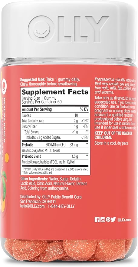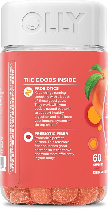 OLLY Probiotic + Prebiotic Gummy, Digestive Support and Gut Health, 500 Million CFUs, Fiber, Adult Chewable Supplement for Men and Women, Peach, 60 Day Supply - 60 Count