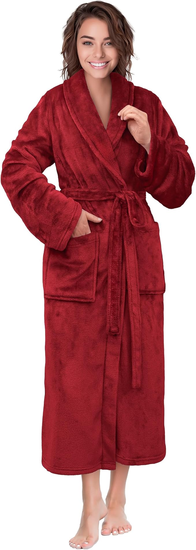 - WOMENS RED FLEECE ROBES: PAVILIA luxurious fleece robe for women is super soft, plush, fluffy and lightweight and you will never want to take it off. Its delicate microfiber construction ensures a velvety touch that will caress your skin with every wear. Features 2 large side pockets for keeping hands warm and storing remotes, glasses, keys, the long robe boasts the perfect fit and comes with a waist strap for easily adjusting to find your ideal comfort level.