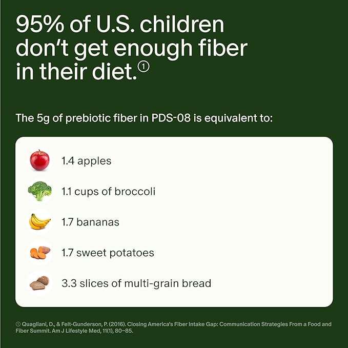 - Bridge the Fiber Gap: 95% of children and adults in the US do not reach their daily recommended fiber intake. PDS-08 contains 5 grams of prebiotic fiber per serving, making it a meaningful and easy complement to a healthy diet. Taking PDS-08 is the same as eating 1.7 bananas or 1.4 apples!