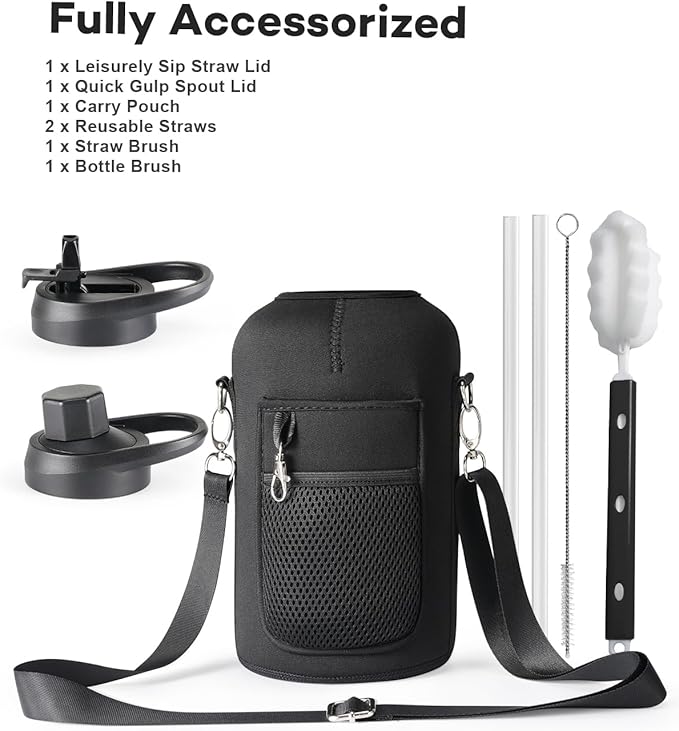 - Hassle-Free Experience: Included with 2 lids, 2 straws, 1 straw brush, 1 bottle brush, and 1 carrying pouch, Topre water jug is fully accessorized to handle any tricky situations. Just choose your style from three capacities (40/64/128).
