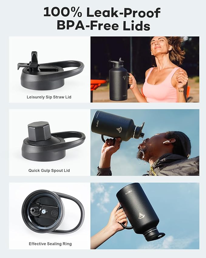 - No Leakage, No Spills: Our stainless steel water bottles comes with a dust-proof flip straw lid and a spill-free spout lid, both 100% leak-proof and spill-proof. The two lids showcase a vibrant color-contrast design, harmonizing with the bottle body's color and adding an extra touch of allure.