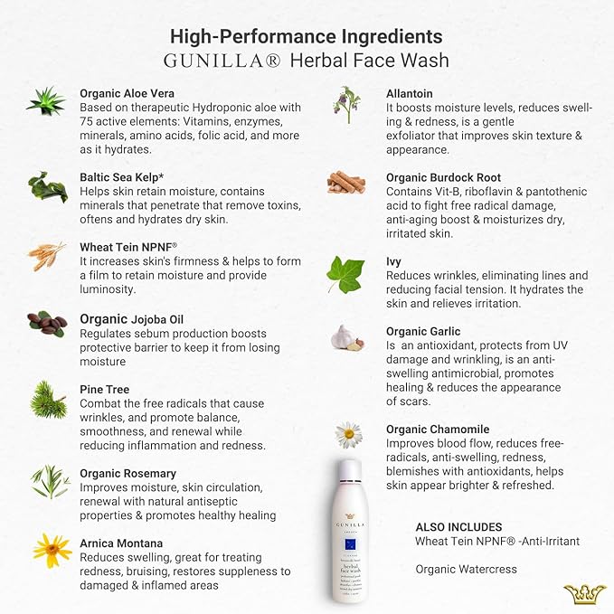 GUNILLA Herbal Face Wash - Very Gentle Daily Cream Cleanser for Dry, Normal, Sensitive Skin. Removes Dirt, Oil & Impurities. Plant-Based. Vegan. Natural. Concentrated 6.7 oz